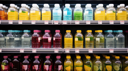 A vibrant array of beverage bottles fills a supermarket shelf, featuring striking colors and various flavors. The visually appealing display invites shoppers to explore refreshing drink options.