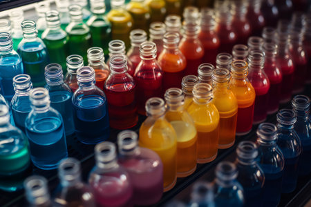Small transparent bottles containing colorful chemical reagents are neatly arranged on a shelf, creating a gradient from blue to red to yellow