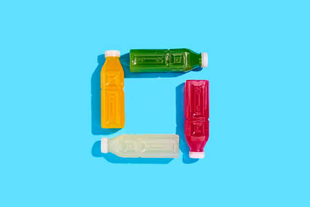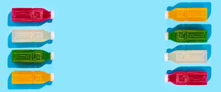 Colored detox drink in plastic bottles on a blue background. Top view, flat lay. Banner