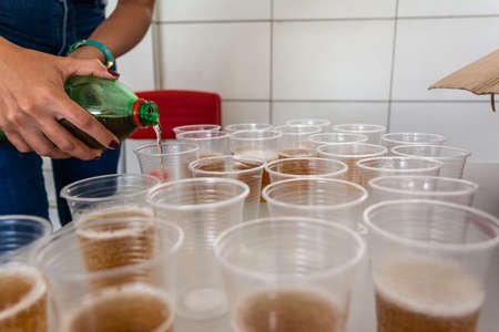 Soda being poured into a plastic cup to be drunk. Salvador, Bahia, Brazil.