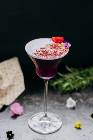 A visually appealing cocktail showcases citrus fruits and vibrant flowers. The composition features a clear glass against a dark surface, casting a strong shadow. The style suggests a refined presentation for editorial or commercial purposes, highlighting fresh ingredients and careful arrangement. Ideal for showcasing beverages in various media.