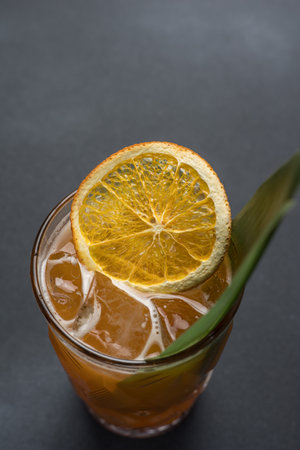 view from above on alcoholic cocktail with ice and citrus
