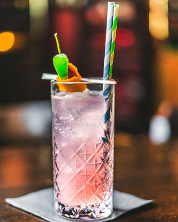 Close up glass of Cocktail on the table. Ready long drink. Bar drinks series