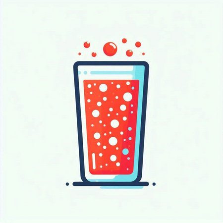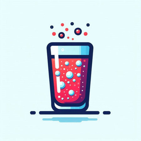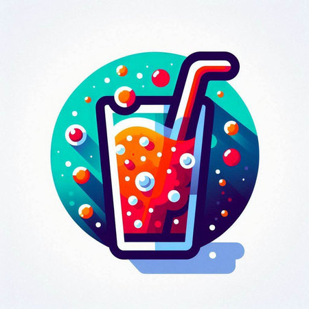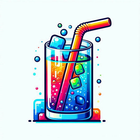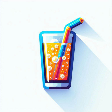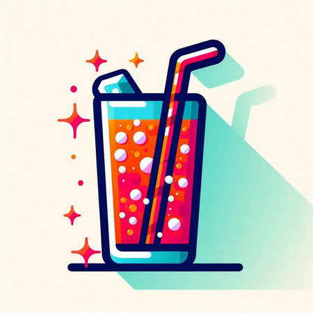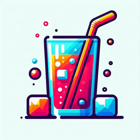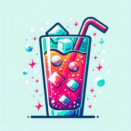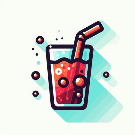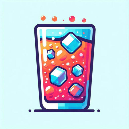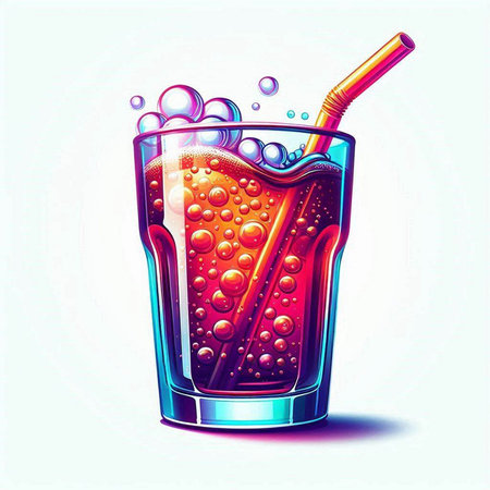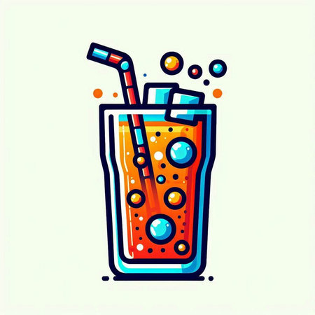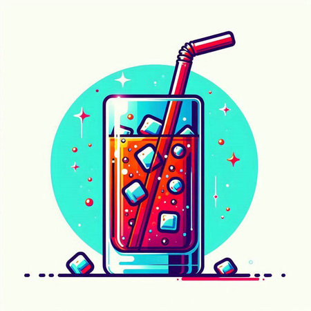 Illustration of a glass of cola with a straw and ice cubes