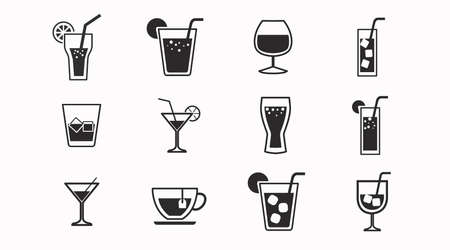 Containing bottle, wine glass, coconut, mineral water, tea, coffee, beer, soda can, juice, cup, cocktail. Vector
