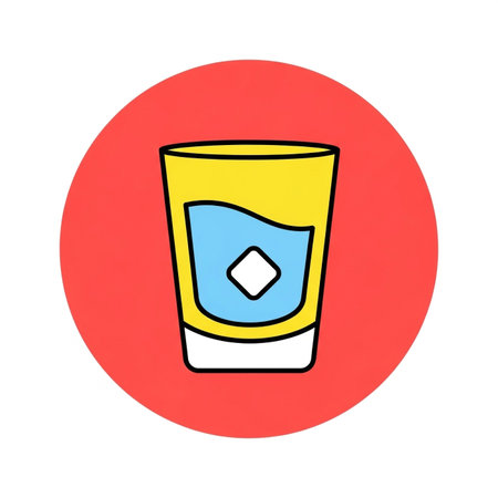 A minimalist illustration presents a glass filled with a red beverage, a straw rising from it, all encased within a clean black circle. The artwork utilizes a restrained color palette and