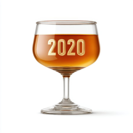 A beautifully crafted crystal glass filled with brown liquid featuring the year 2020 prominently, perfect for celebration and elegant gatherings on a white background.