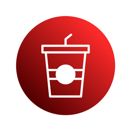 A stylized white line art icon of a soda cup with a straw inside of a red circle, perfect for a variety of projects.