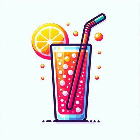 Vector illustration of a glass of juice with a straw and bubbles.