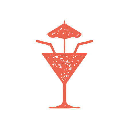 Romantic couple cocktail in goblet with two straw umbrella hand drawn decorative red grunge texture