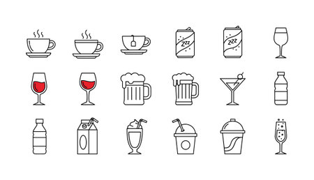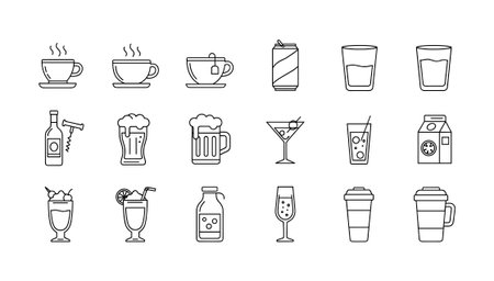 A set of various hand drawn beverage icons including coffee, tea, beer, wine, soda, and cocktails. Simple line art vector illustration for menus, websites, and design projects.