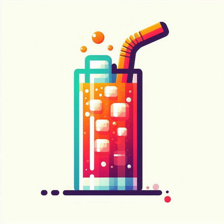 Illustration of a glass of cola with ice cubes and straw