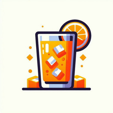 Orange juice with ice cubes and lemon slice. Vector flat illustration.