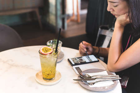Glass of fresh passion fruit drink on table with woman using mobile phone.