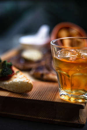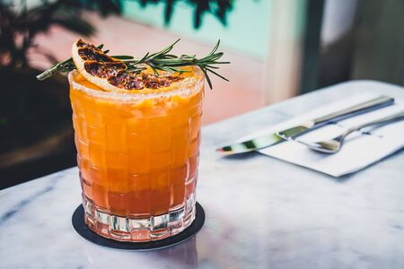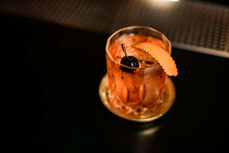 ice cold modern Cocktail gourmet craft white with Sweet caramels decoration slice Author Drink - on bar counter . Close-up Top view . Copy paste space design barman people and luxury nightclub