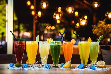 Side view on the row of different healthy organic delicious fruit and vegetable smoothies in glasses on the wooden table with blurry bokeh background, horizontal format