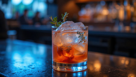 Refreshing cocktail served on a marble bar top with mint garnish at a trendy evening location