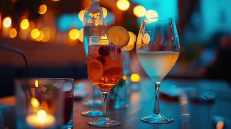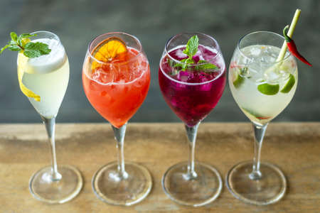 mixed spritzer wine cocktails selection with fruit in outdoor bar table