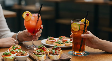 Generative AI : Happy friends drinking together at cocktail bar restaurant Group of young people enjoying night out toasting drinks on happy hour Top view