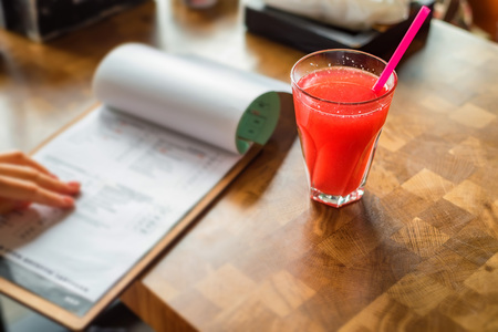 A glass of watermelon juice and mango smoothie with plastic straw in a restaurant in Bali, Indonesia