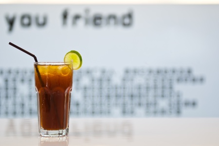 Iced tea with lime and ice cubes. Iced cold summer drink
