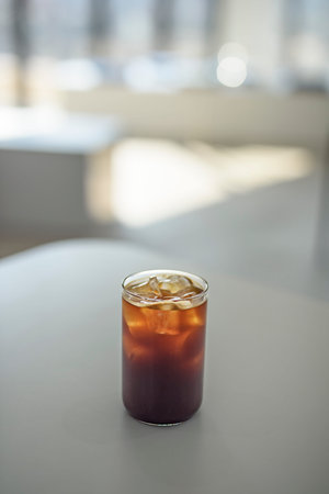 Iced americano in a glass cup on a white table in the cafe.