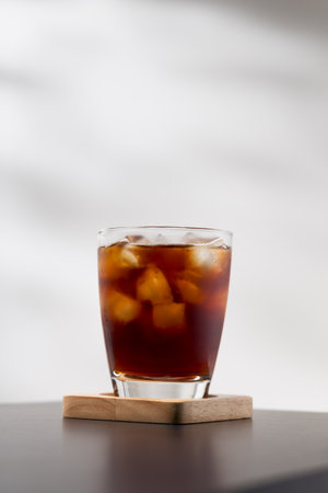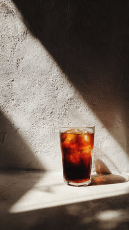 Cola with ice cubes in a glass with shadow on the wall.