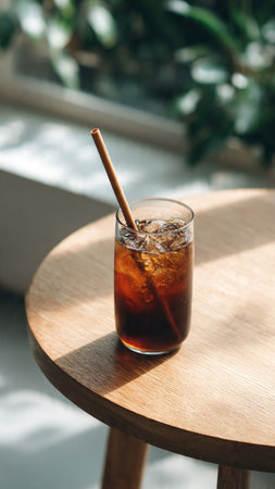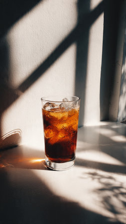 glass of cola with ice cubes on table in sunlight and shadows
