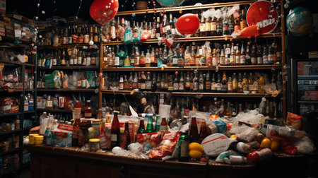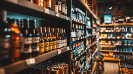 Liquor store shelves filled with an assortment of bottles, with soft focus creating a warm, inviting atmosphere. Ideal for themes of beverages, retail, and nightlife.