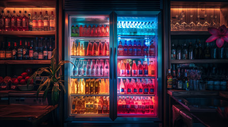 Colorful Drinks Illuminated in a Bar Refrigerator