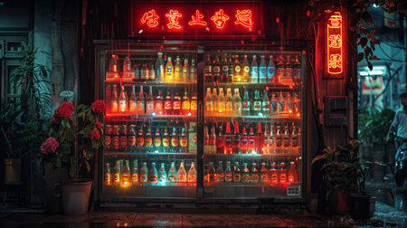 Neon Sign Illuminated Beverage Cooler In Rainy Asian City