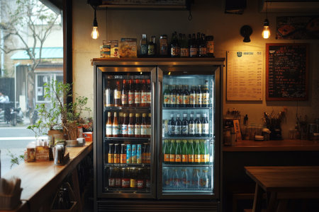 A modern grocery store interior showcasing a variety of refrigerated drinks neatly organized on shelves, with a soft focus on the foreground, creating a clean and vibrant shopping environment.