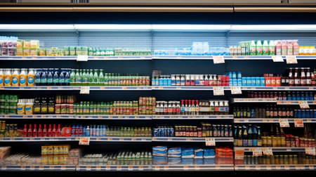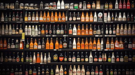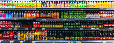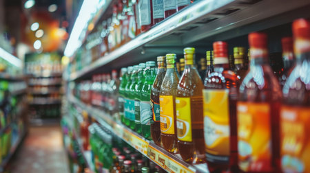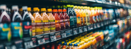 A vibrant scene of colorful bottles of various drinks neatly lined up on supermarket shelves, with soft focus and dynamic lighting creating a lively and modern retail atmosphere. Ideal for themes related to beverages, shopping, and consumerism.