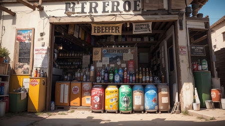 A vibrant and nostalgic display of various beverages and snacks in a retro-styled store, featuring bold colors and vintage packaging. The playful setting captures the essence of a classic, colorful marketplace.