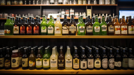 Bottles of beverages are arranged on shelves, showcasing a variety of colors and packaging. The composition uses selective focus, blurring the background to emphasize the products. Warm lighting creates a soft atmosphere, suggesting an indoor setting. This image could be used in advertising, retail, or editorial contexts.