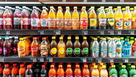 A focused view of an aisle filled with juice bottles in a grocery store, showing a colorful and organized display. The vibrant colors and variety of products emphasize convenience and choice, perfect for themes of shopping, retail, and healthy lifestyle.