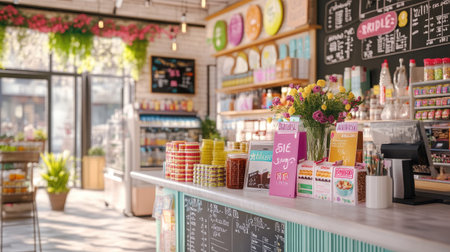 A bright and modern cafe interior showcasing an inviting counter filled with colorful products, fresh flowers, and a cozy atmosphere perfect for relaxation.