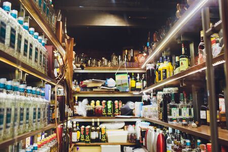 Ufa, Russia, 12 June, 2018: Bottles of alcohol and spirits at a restaurant bar. Large variety of imported and domestic labels, brands and supplies for making cocktails and drinks. Copy space.