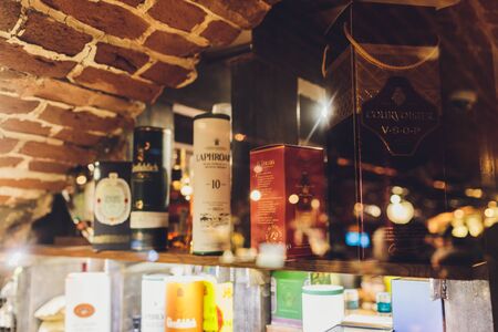 Ufa, Russia, 1 January, 2020: Several types of bottled alcohol are displayed on some shelves in a pub.