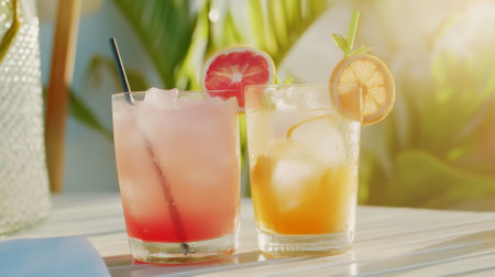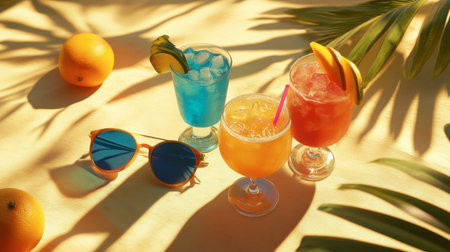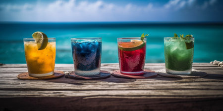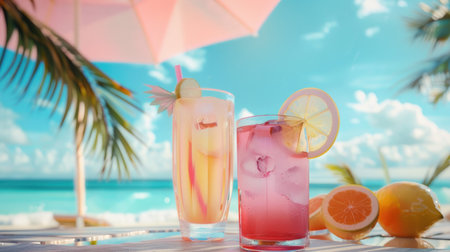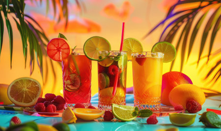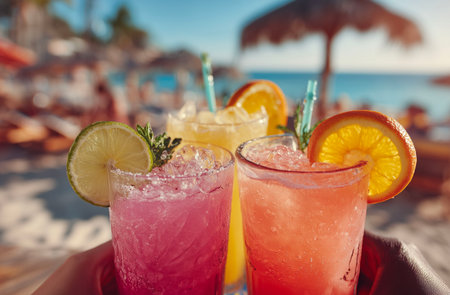 Vibrant fruit cocktails on a tropical beach setting