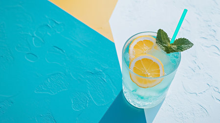 Refreshing drink in clear glass with lemon slices set against colorful summery background of turquoise, white and yellow