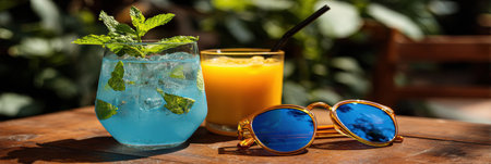 Refreshing summer cocktails on table with greens and fruits, tropical vacations vibes background, copy space, AI Generated