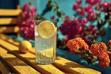 Refreshing glass of lemonade with lemon slices sits on a yellow bench. Bright pink and orange flowers create a vibrant backdrop, evoking a sunny, cheerful atmosphere