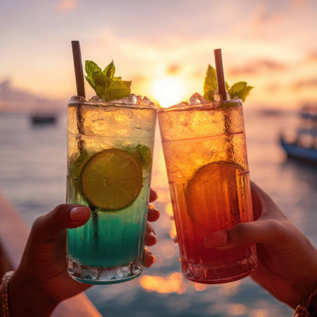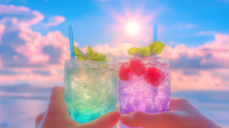 Two glasses of cocktails are held, featuring colorful layers of liquid, garnishes, and straws. The glasses are held by people with a blurred background suggesting a sunset. The image displays bright colors and a balanced composition. Potential uses include promoting drinks or representing leisure and celebration.