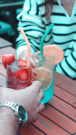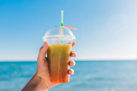The guy's hand holds a colored chilled non-alcoholic cocktail against the background of the sea.
