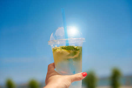 cool refreshing lemonade in hand. woman hold ice invigoration summer drink. concept quench thirst