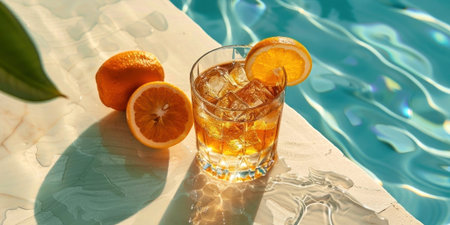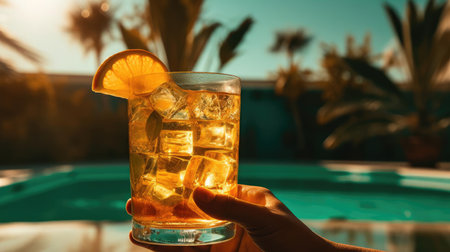 Chill by the pool with a refreshing orange drink, capturing the essence of summer in every sip. Ice cubes glisten in the sunlight, inviting relaxation and enjoyment. Generated A.I.