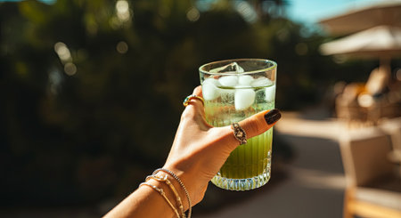 A hand presents a cool green drink with ice, set against a lush outdoor backdrop, evoking a sense of leisure and refreshment in a sunny environment, AI generated