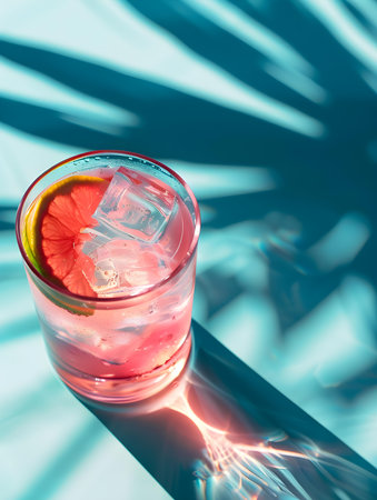 Cold berry cocktail or lemonade in glass on background with palm leaves and shadows