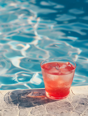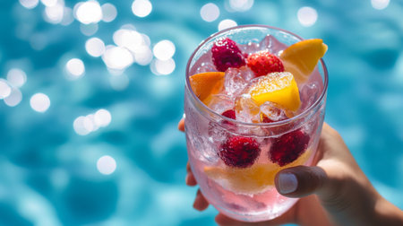 This vibrant image features a refreshing summer cocktail filled with ice and colorful fruits, captured near a sparkling swimming pool. Perfect for summer vibes!